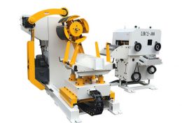 三合一送料機是結合了料卷架、上料臺車、矯正機、NC送料機的功能,大大地縮小了以往送料裝置所占的面積,且同時可配合沖床工作。裝在料卷架上的料卷是由料卷下方的感測器所控制,利用NC送料機可一邊整平,一邊將預先設定好長度的材料同步送入沖床模具內。各輔助裝置的運轉是以油壓、空壓或電氣做為動力源。料卷機采用懸臂式壓料,馬達傳動控制,可正反轉,及油壓缸方式挾持鐵圈,操作簡單,保養容易,故障率低。矯正送料
